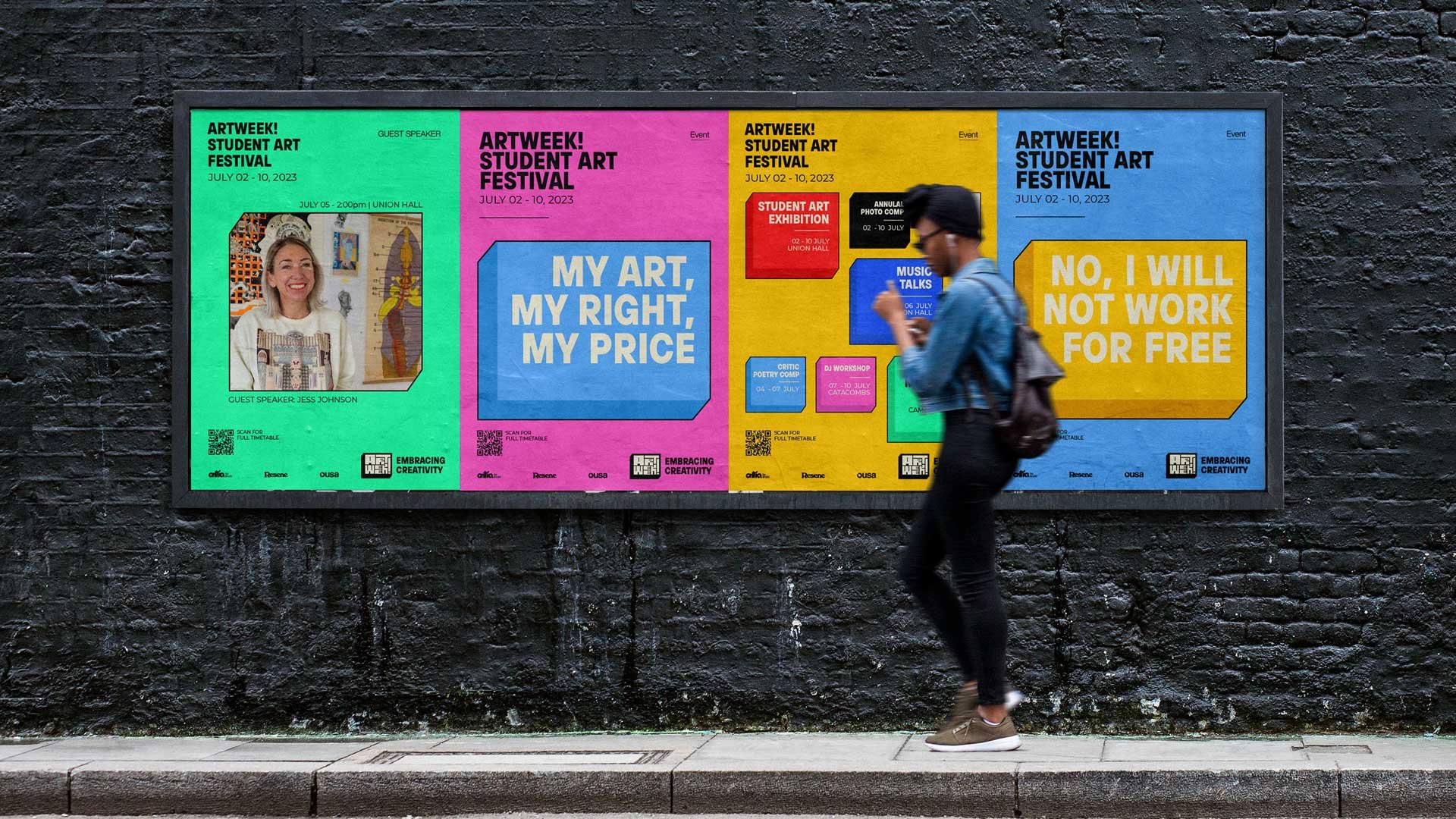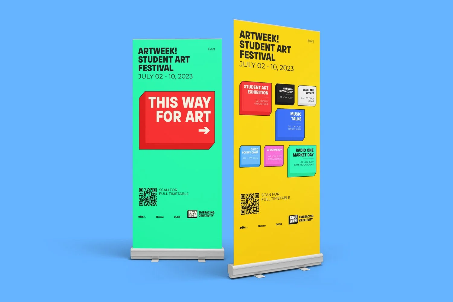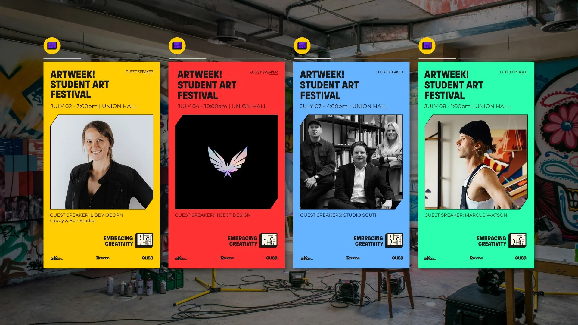 Artweek, a celebration of student creativity that brought together the University of Otago and Otago Polytech communities. My goal was to craft a dynamic and bold visual identity for this event. Aimed to inspire them to embrace their creative spirits and connect with one another through a series of art-based events.