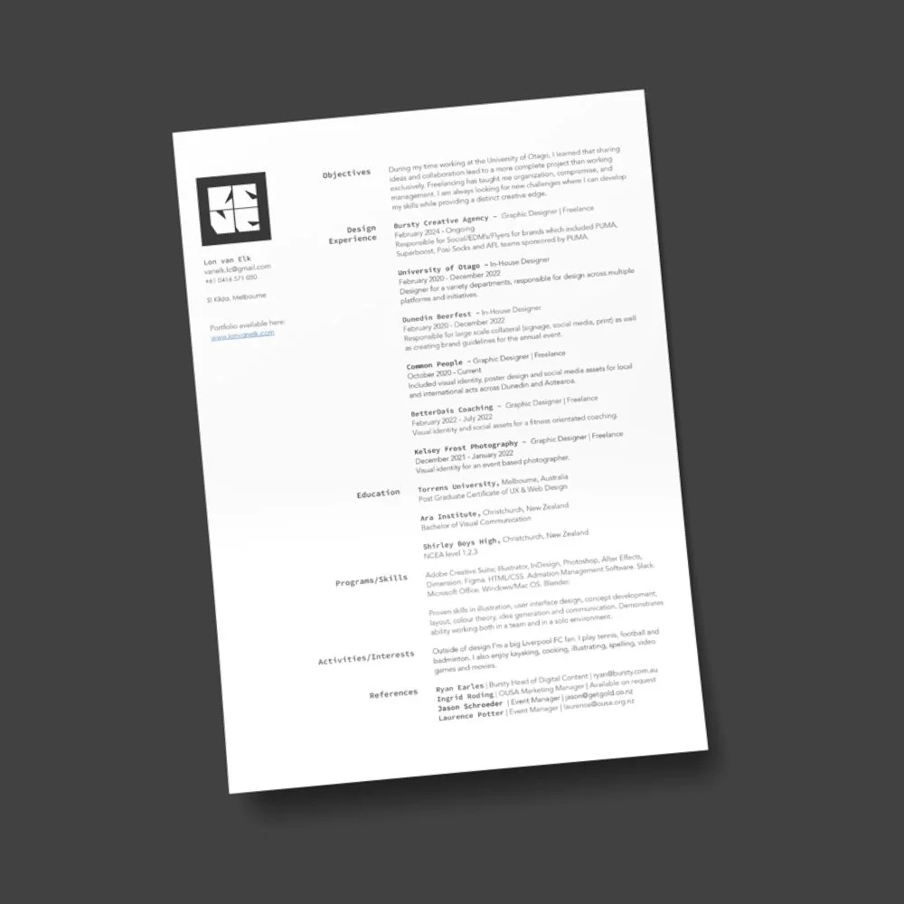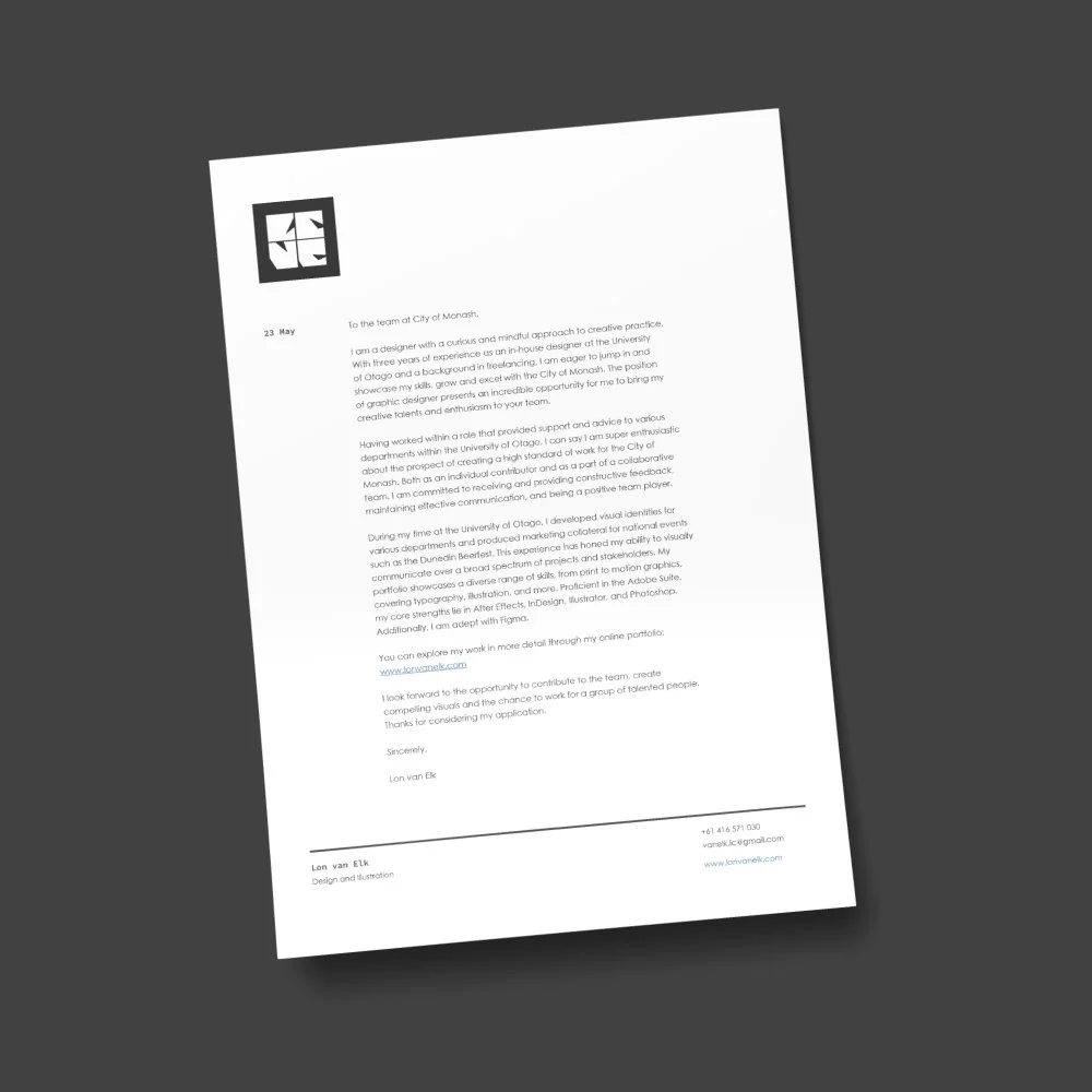 A personal logo that demonstrates an amalgamation of my vision and interests. When I work on a project I aim for a mindful and modern approach without leaving out my own touch of flair. Often I draw on typographic outcomes as well as illustrative elements to give the project that feel of originality.