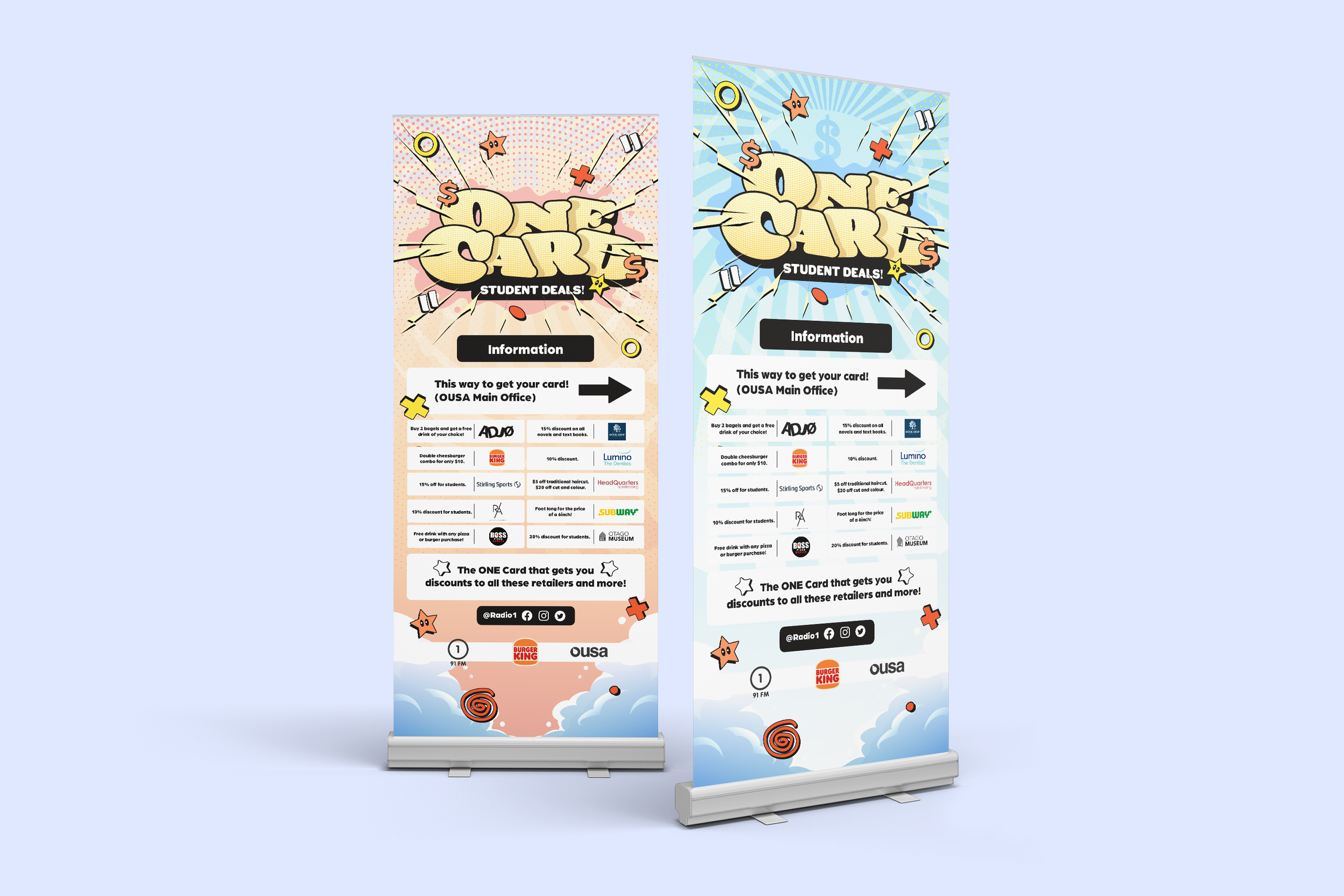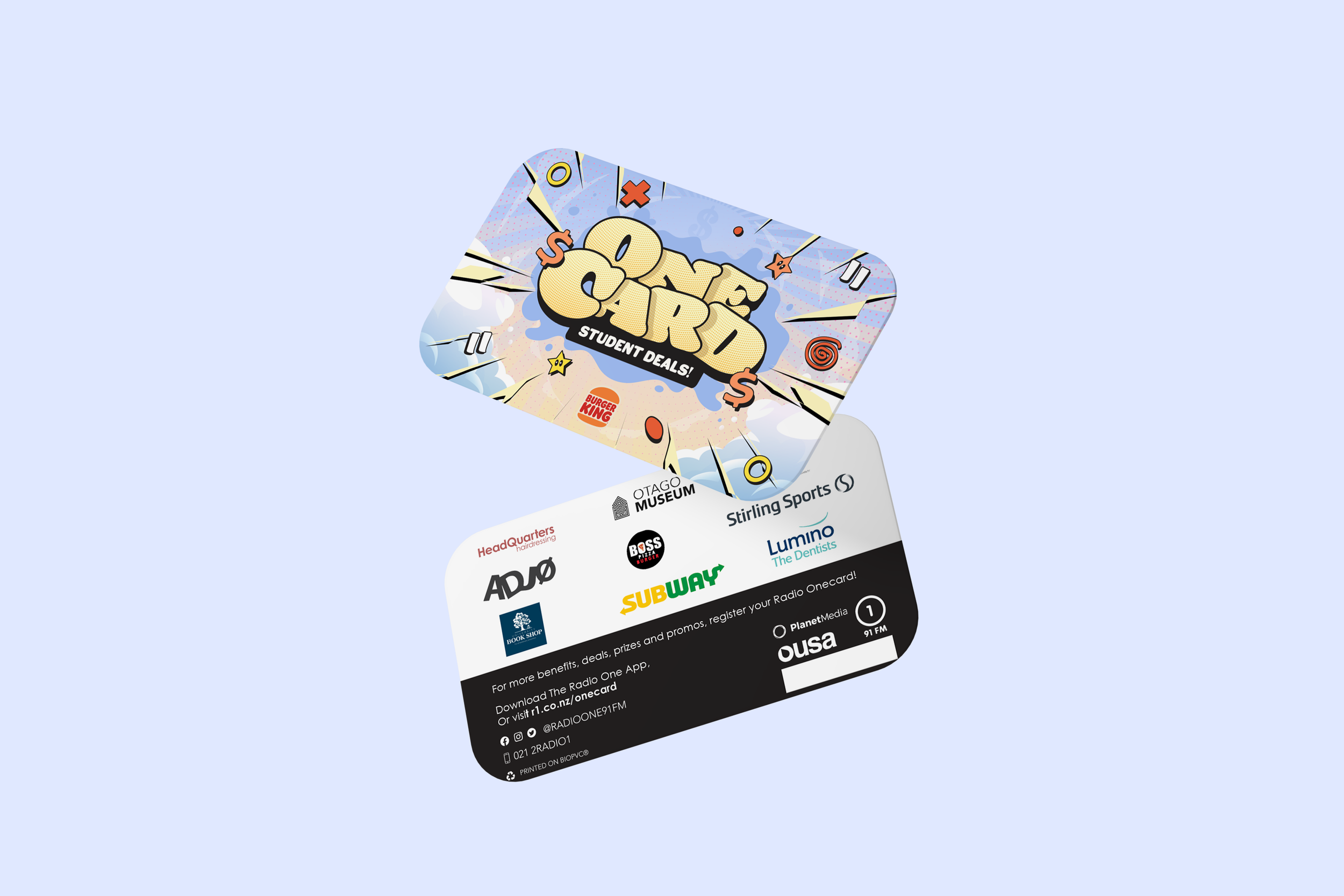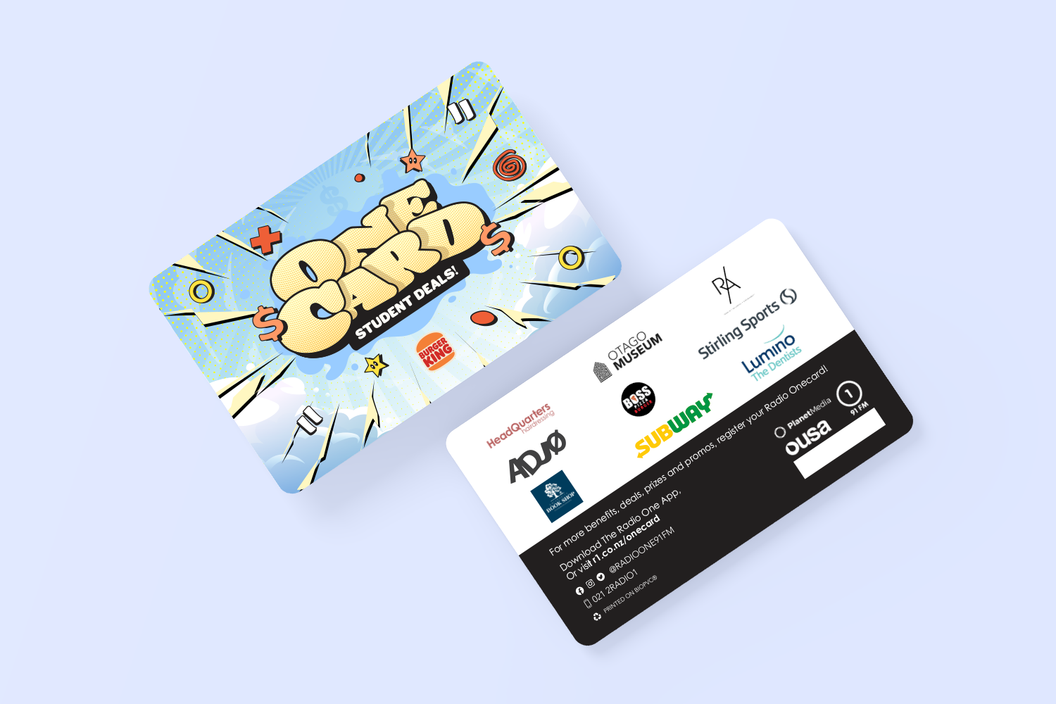 The Radio 1 OneCard is a discount card primarily aimed at students, offering discounts on products and services in Dunedin. Each year, the design gets a refresh. This year, I embraced a vibrant and colorful approach, departing from the usual grayscale. Drawing inspiration from graffiti motifs and bold typography, the design became more student-centric.