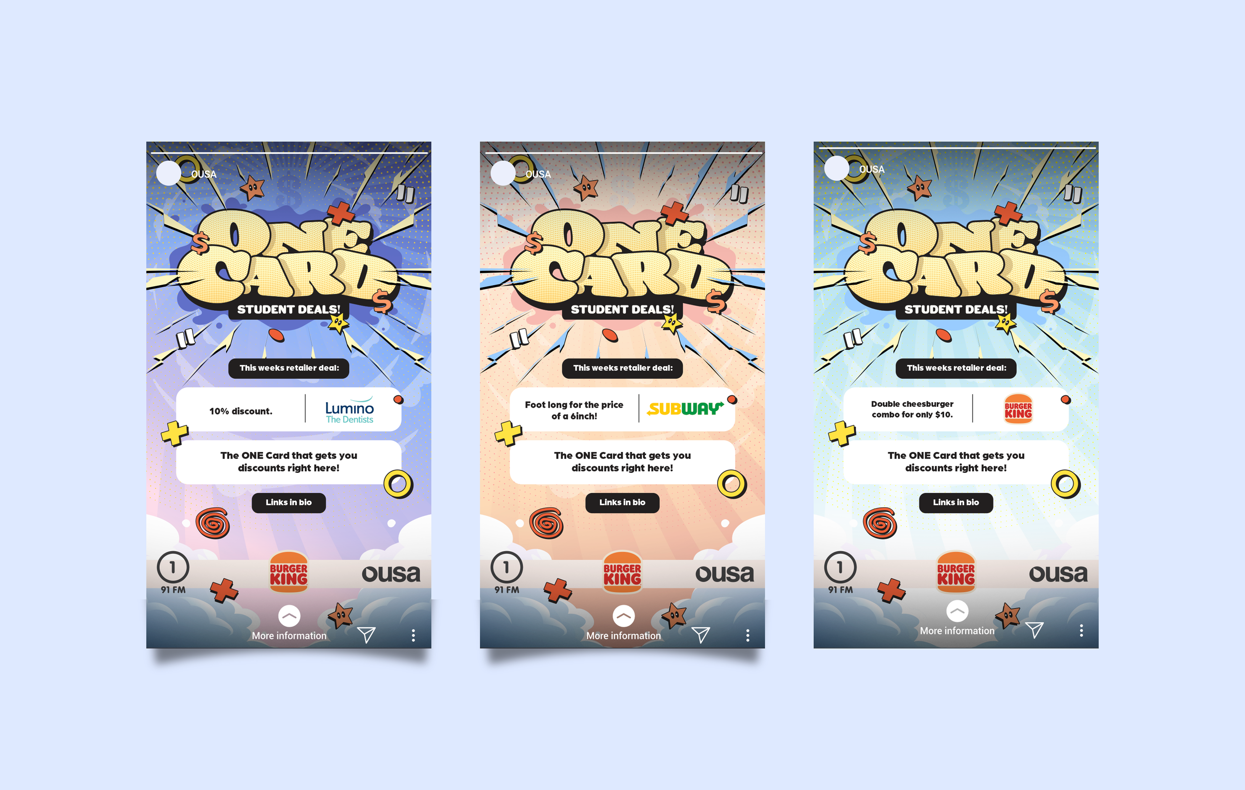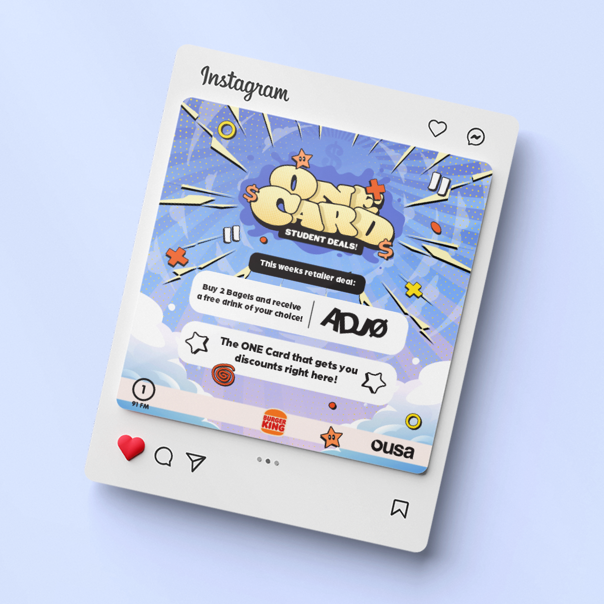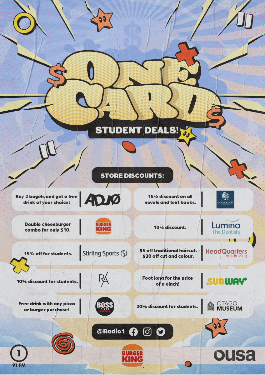 The Radio 1 OneCard is a discount card primarily aimed at students, offering discounts on products and services in Dunedin. Each year, the design gets a refresh. This year, I embraced a vibrant and colorful approach, departing from the usual grayscale. Drawing inspiration from graffiti motifs and bold typography, the design became more student-centric.