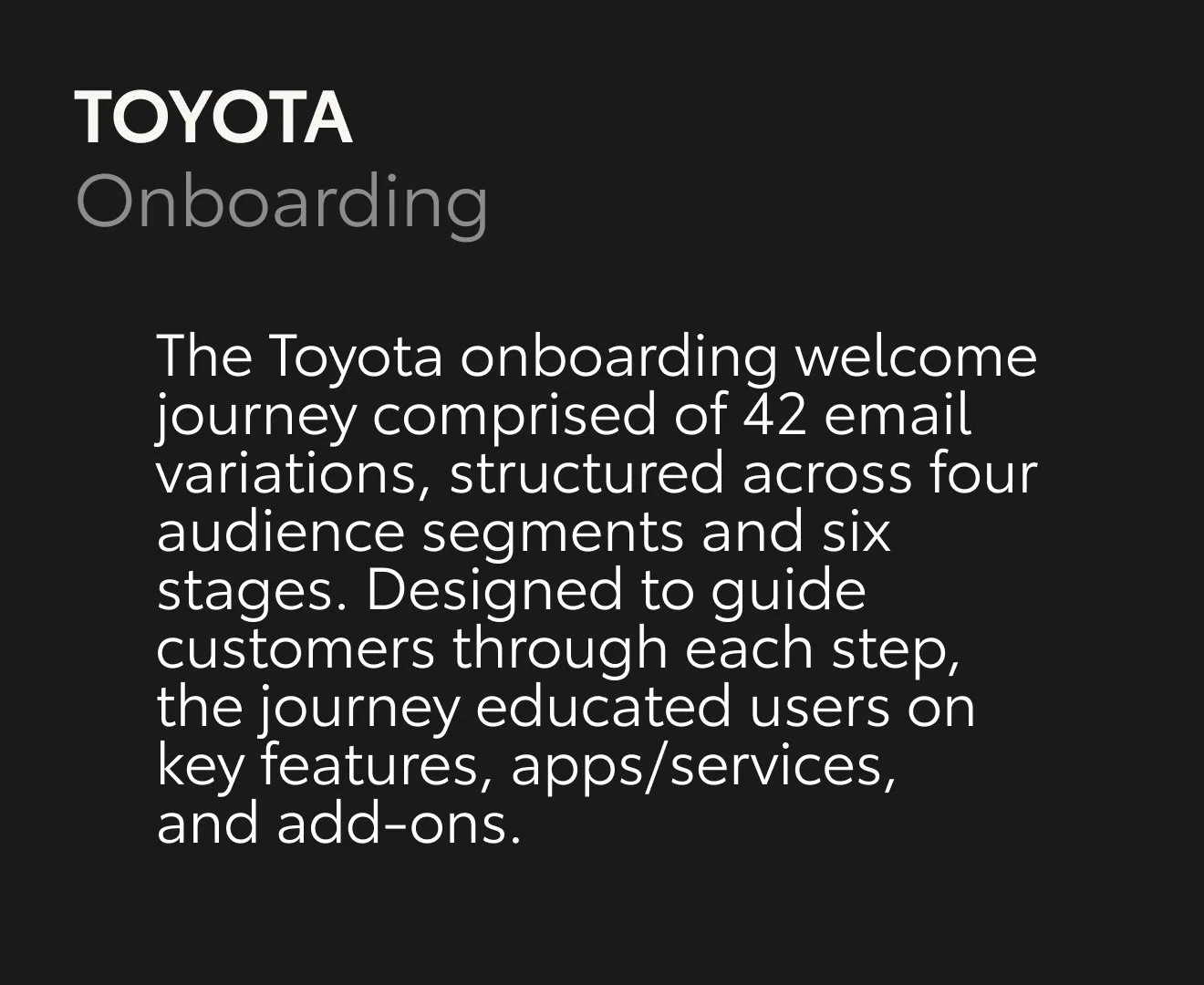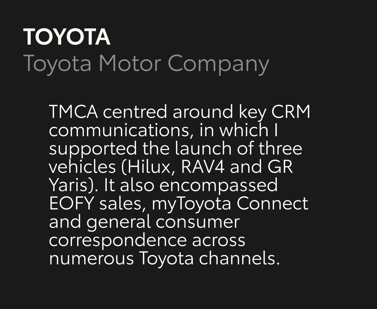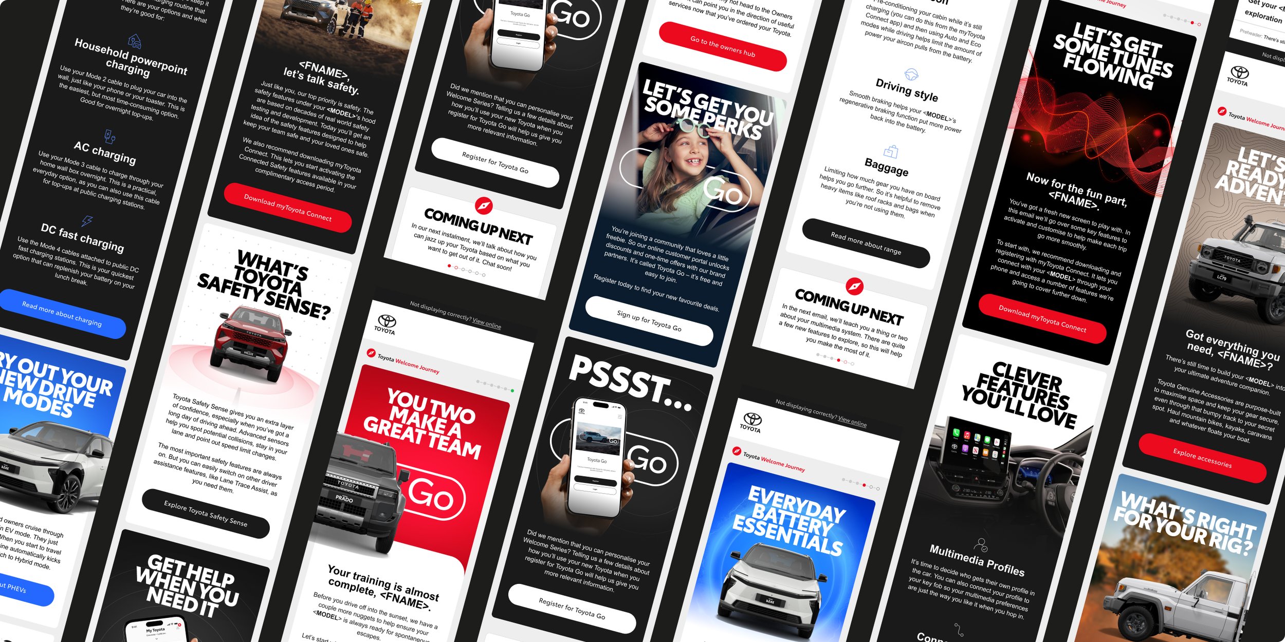 Designer focused on Toyota CRM, delivering work across a range of touchpoints—from a complete refresh of the customer onboarding journey to car launch EDM communications, as well as the creation of physical materials for dealerships and business partners.