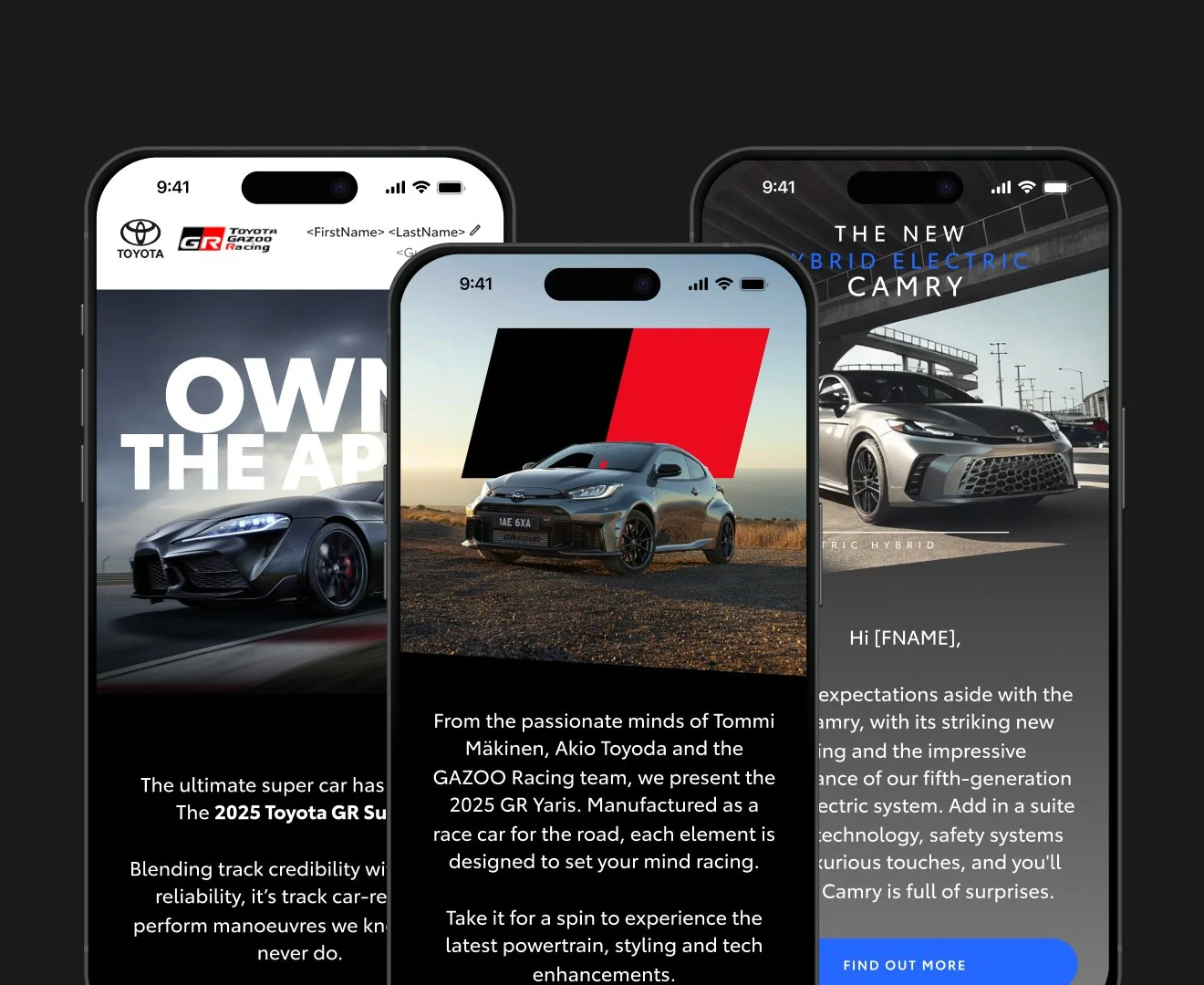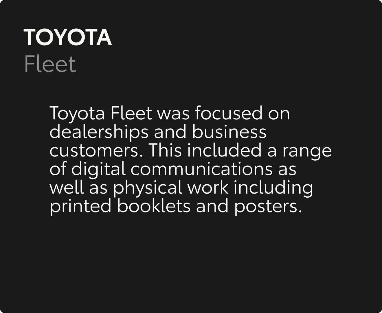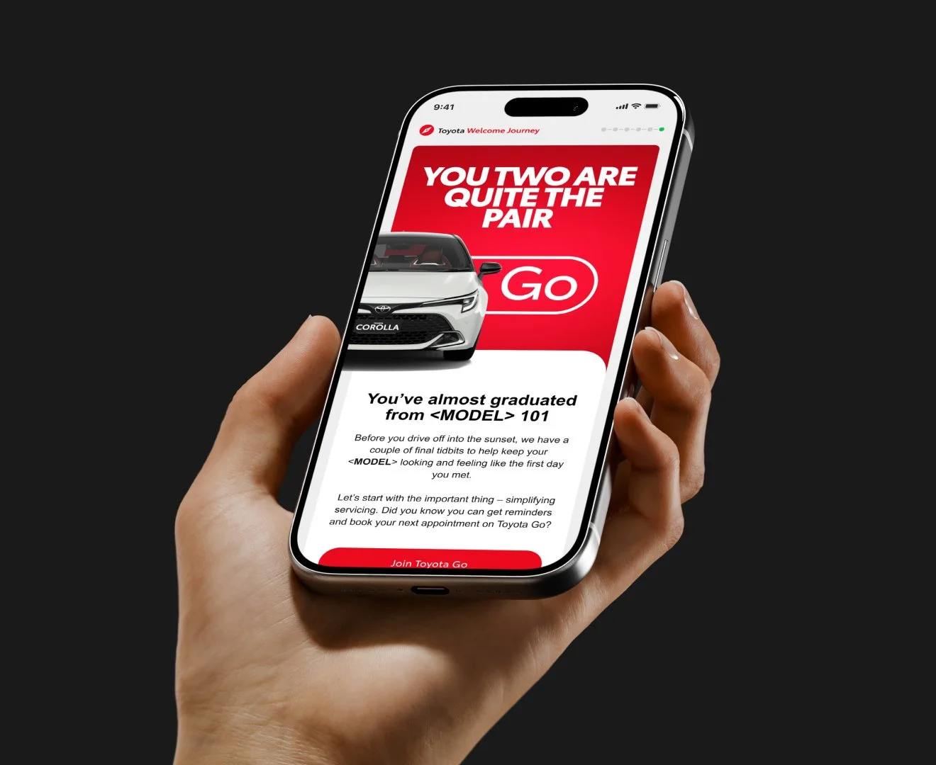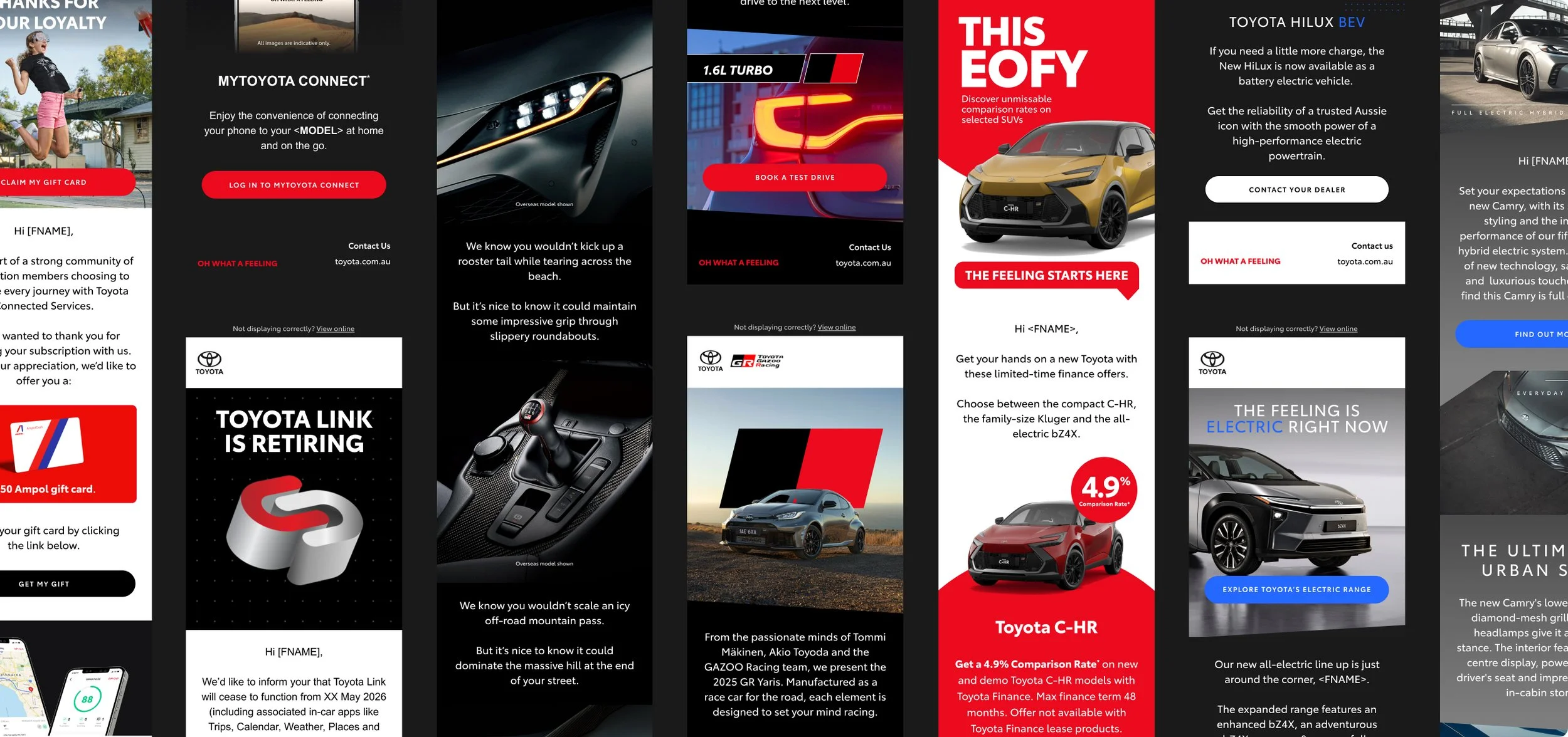 Designer focused on Toyota CRM, delivering work across a range of touchpoints—from a complete refresh of the customer onboarding journey to car launch EDM communications, as well as the creation of physical materials for dealerships and business partners.